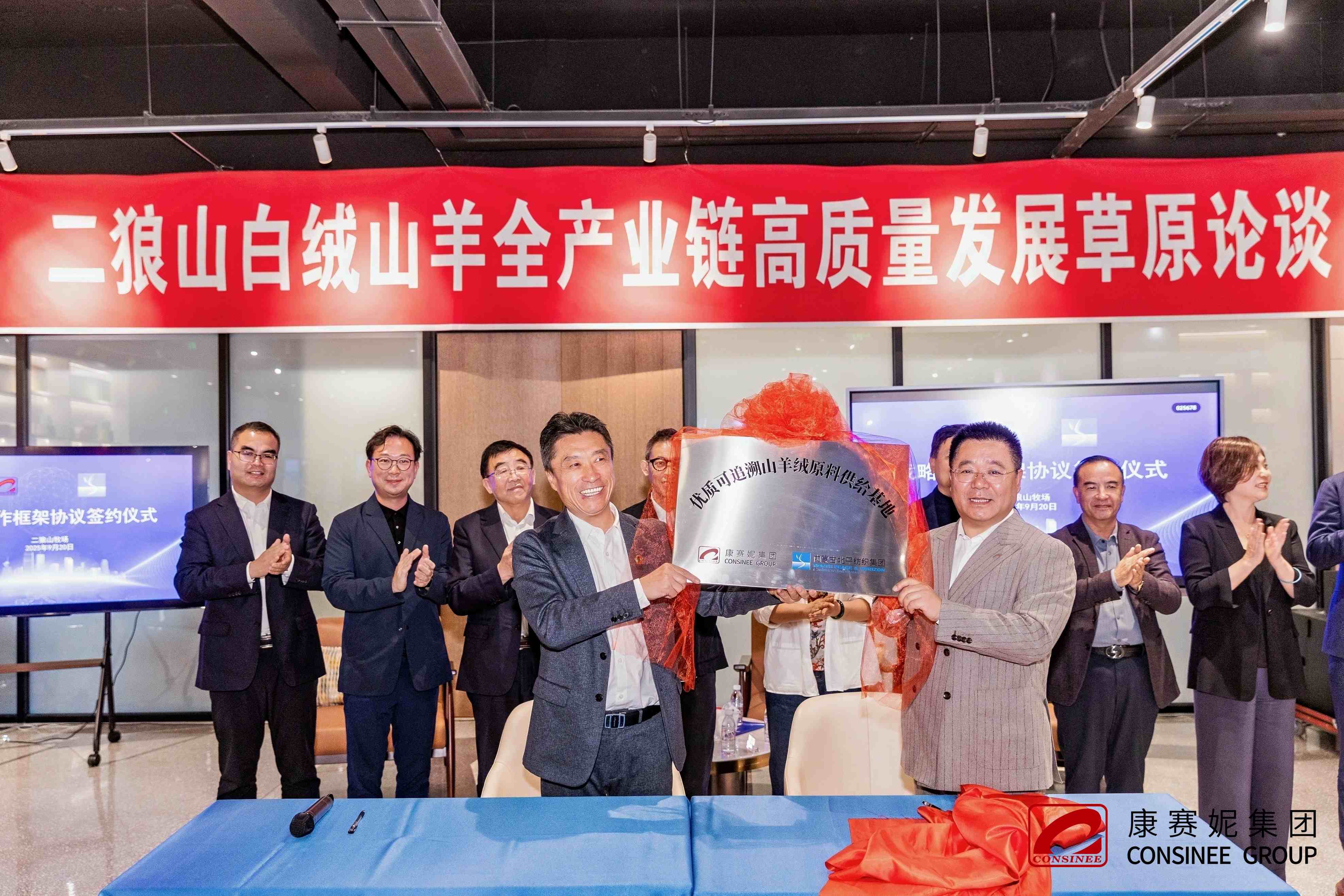 康赛妮一直致力于跟踪前端育种到后端纺纱的全产业链加强,始终着眼于优良品种的保护工作。论谈的签约仪式上,康赛妮集团与内蒙古北平纺织有限责任公司二狼山牧场签订战略合作协议,双方将共建“优质可追溯山羊绒原料供给基地”与“优质二狼山绒山羊联合育种基地”,扩大无毛绒供需规模,改善育种养殖条件,并通过搭建纤维检验中心、信息共享中心等,加强技术、人才交流,从种源保护改良、引入现代化牧场管理模式等源头环节提升羊绒原料品质,推动山羊绒全产业链高质量可持续发展,助力地方经济。