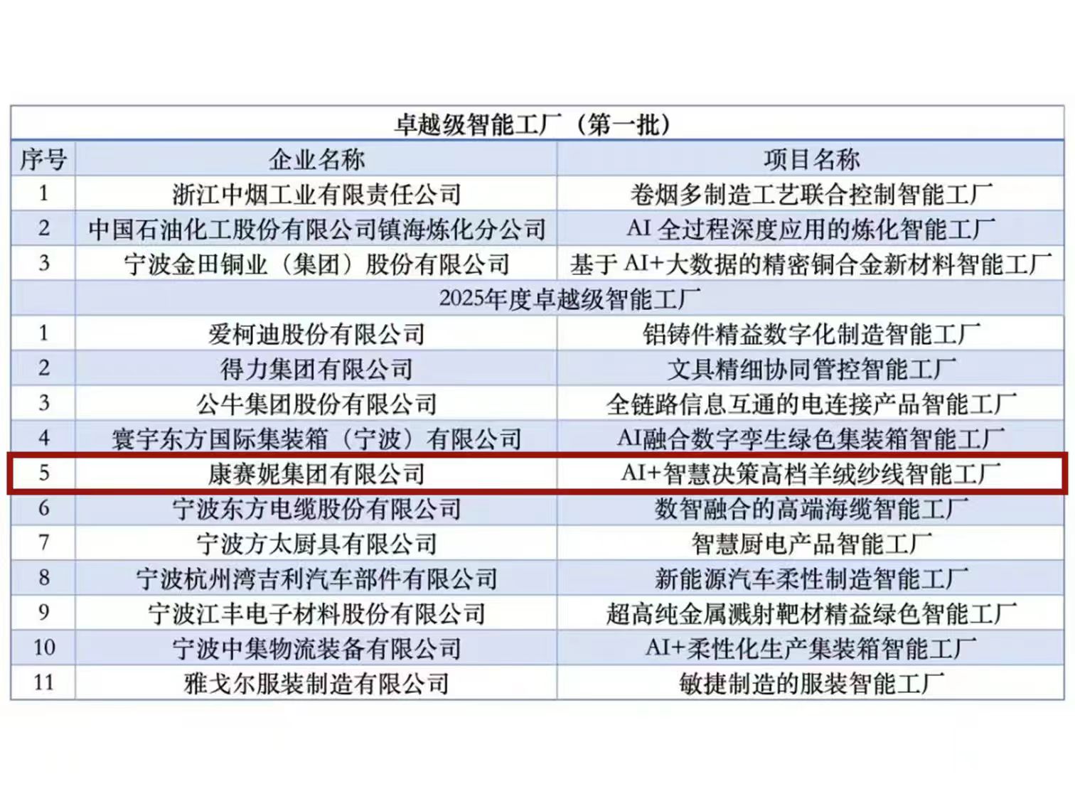 作为羊绒行业智能制造的先行者,康赛妮在智能制造领域再攀新高峰。近日,工业和信息化部发布的2025年度卓越级智能工厂名单公示期已结束,康赛妮集团“AI+智慧决策高档羊绒纱线智能工厂”荣获“2025年度卓越级智能工厂”称号!与此同时,上半年正式投产的高端奢侈品面料数字化工厂生产如火如荼,海南智能制造基地项目建设也进入冲刺阶段。康赛妮的智能制造版图持续扩张,彰显了纺织行业在数字化转型浪潮中的积极探索,也为行业未来发展树立了新的标杆。