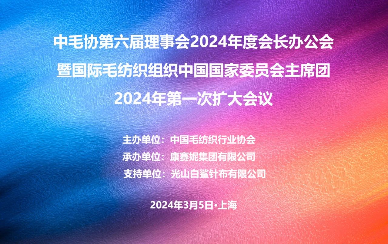 3月5日,康赛妮上海中心将举办“中毛协第六届理事会2024年度会长办公会暨国际毛纺织组织中国国家委员会主席团2024年第一次(扩大)会议”。届时,中国毛纺织行业协会会长刘家强、中国纺织工业联合会副会长杨兆华、康赛妮集团董事长、总裁薛惊理将出席活动并作出发言,与来宾针对“应对变局,共谋发展”展开交流座谈。