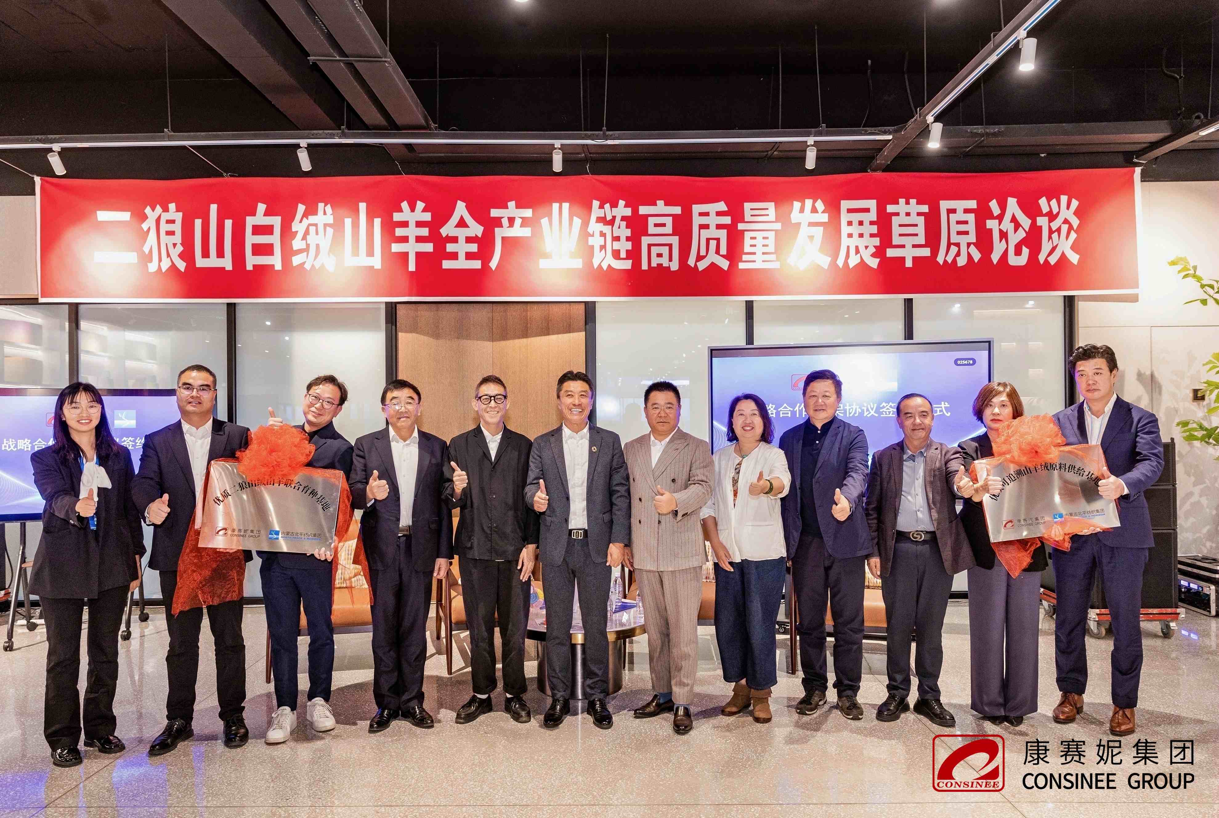 康赛妮一直致力于跟踪前端育种到后端纺纱的全产业链加强,始终着眼于优良品种的保护工作。论谈的签约仪式上,康赛妮集团与内蒙古北平纺织有限责任公司二狼山牧场签订战略合作协议,双方将共建“优质可追溯山羊绒原料供给基地”与“优质二狼山绒山羊联合育种基地”,扩大无毛绒供需规模,改善育种养殖条件,并通过搭建纤维检验中心、信息共享中心等,加强技术、人才交流,从种源保护改良、引入现代化牧场管理模式等源头环节提升羊绒原料品质,推动山羊绒全产业链高质量可持续发展,助力地方经济。