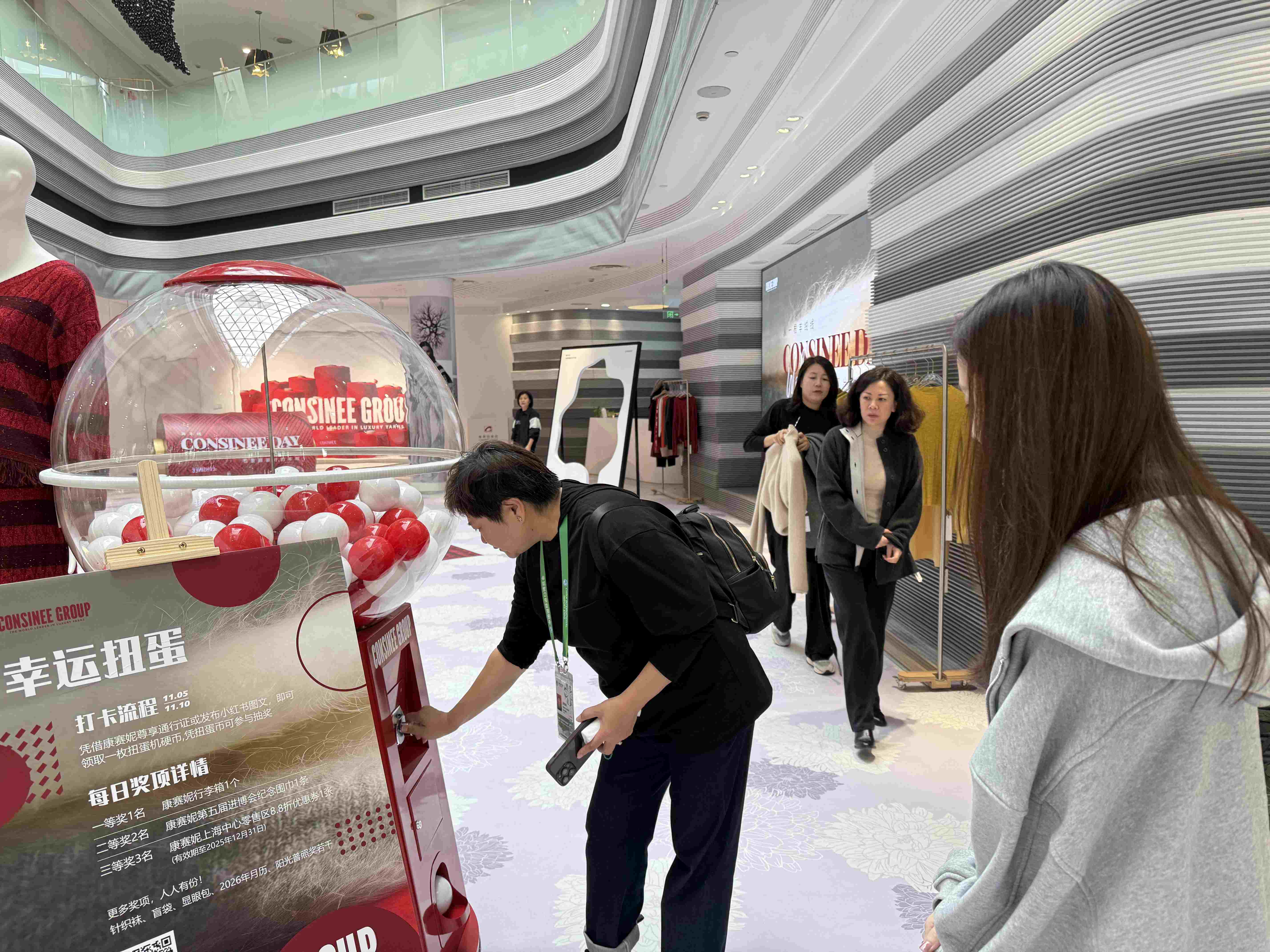 与进博展厅遥相呼应的康赛妮上海中心,正扮演着“商务链接器”的重要角色。这里承接了从进博会分流而来的核心采购商,远离喧嚣的深度对接让合作洽谈更高效,让进博会上的“意向”快速转化为“订单”。现场暗藏“幸运彩蛋”,独特扭蛋机转出重磅惊喜——定制行李箱、进博联名围巾、羊绒衫大额优惠券等,每一颗扭蛋都藏着满满诚意,现场人气火爆,惊喜不断!