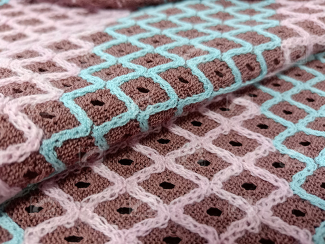 LOTUS因纱线结构特殊,为达到较佳的布面花型效果,建议使用两个或多个导纱器进行针织。