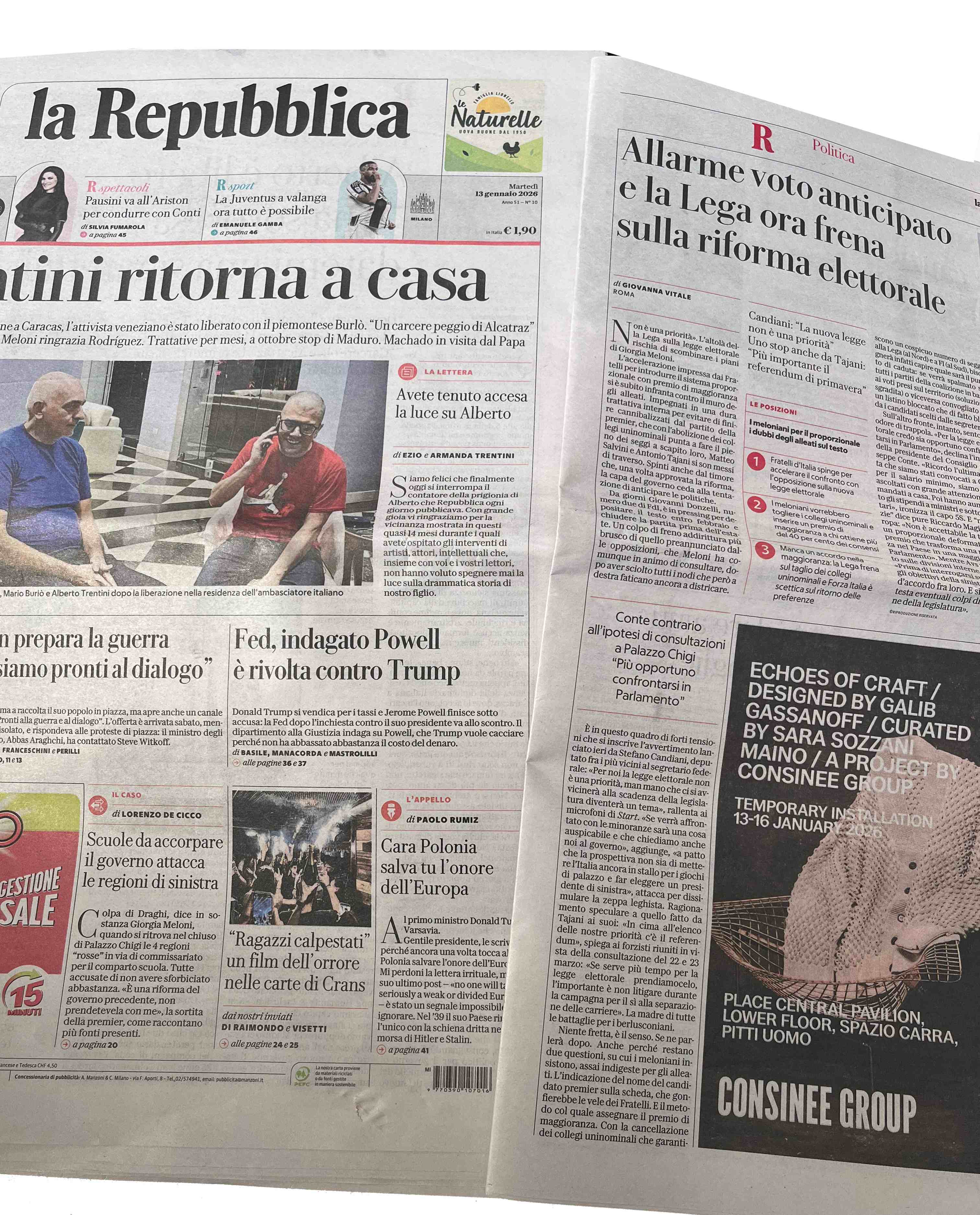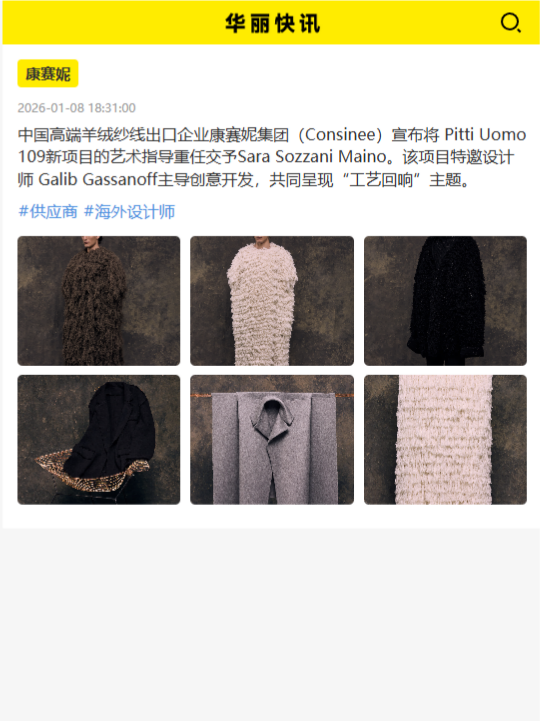集团展位凭借兼具品质感与设计感的陈列,一举成为全场焦点,热度居高不下。权威媒体的争相聚焦,更将这份火爆氛围推向高潮。PITTI UOMO官方媒体、意大利 La Repubblica报纸、意大利财经报等国际平台,以及华丽志、ELLE MEN等国内时尚权威,纷纷将镜头对准康赛妮,深度解读品牌的可持续实践。