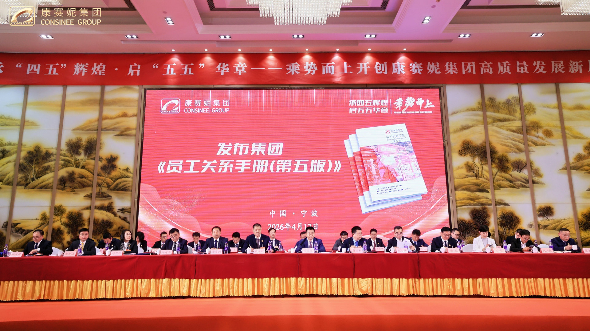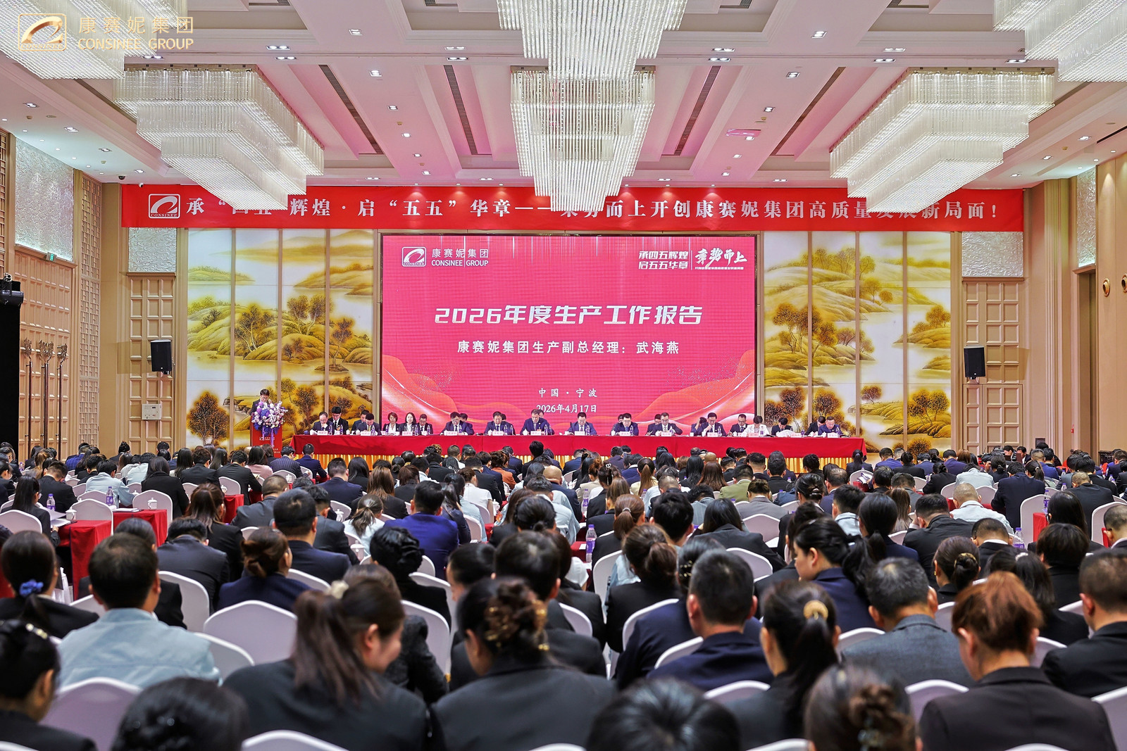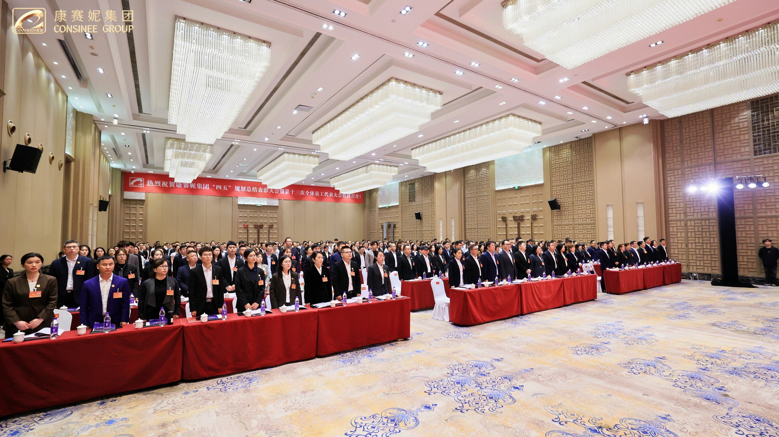 春启新程,功耀华章!2026年4月17日上午,康赛妮集团“四五”规划总结表彰大会暨第十三次全体员工代表大会开幕式在柏林环球酒店隆重召开!大会以“承四五辉煌·启五五华章,乘势而上开创康赛妮集团高质量发展新局面”为主题,来自集团总部各职能部门、各生产分厂班长以上管理干部、新进大学生代表、老员工代表,来自集团各驻外分支机构列席代表和特邀代表,以及全程参与“四五”规划的建设者们共计五百余人,共忆峥嵘岁月,共庆发展硕果,共绘奋进新篇,以昂扬之姿,开启集团高质量发展的全新征程!