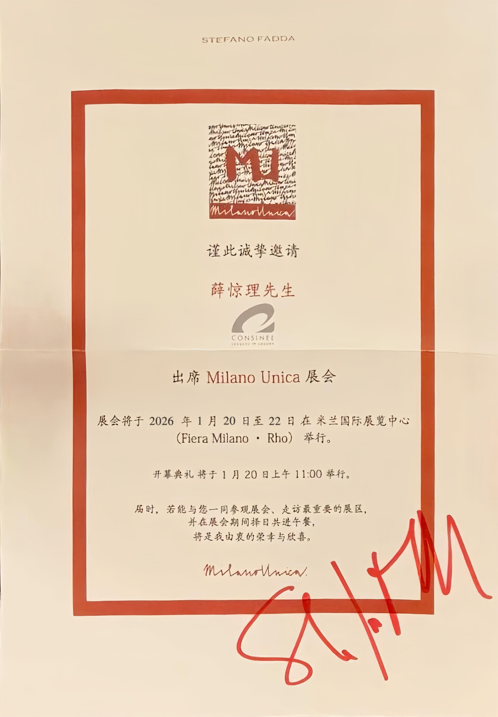 此前,意大利时间1月20日,第42届Milano Unica展会在米兰国际展览中心盛大启幕。康赛妮集团董事长、总裁薛惊理受邀出席开幕式并观展,与全球行业精英深入探讨面料创新方向与市场发展机遇。作为全球高端纺织面料领域的标杆盛会,该展会是行业内极具影响力的交流平台。此次参会正式开启康赛妮集团面料Milano Unica模式,标志着集团在深耕国际高端面料市场、链接全球优质时尚资源的道路上迈出关键一步,为后续深化国际合作、洞察行业风向筑牢根基。