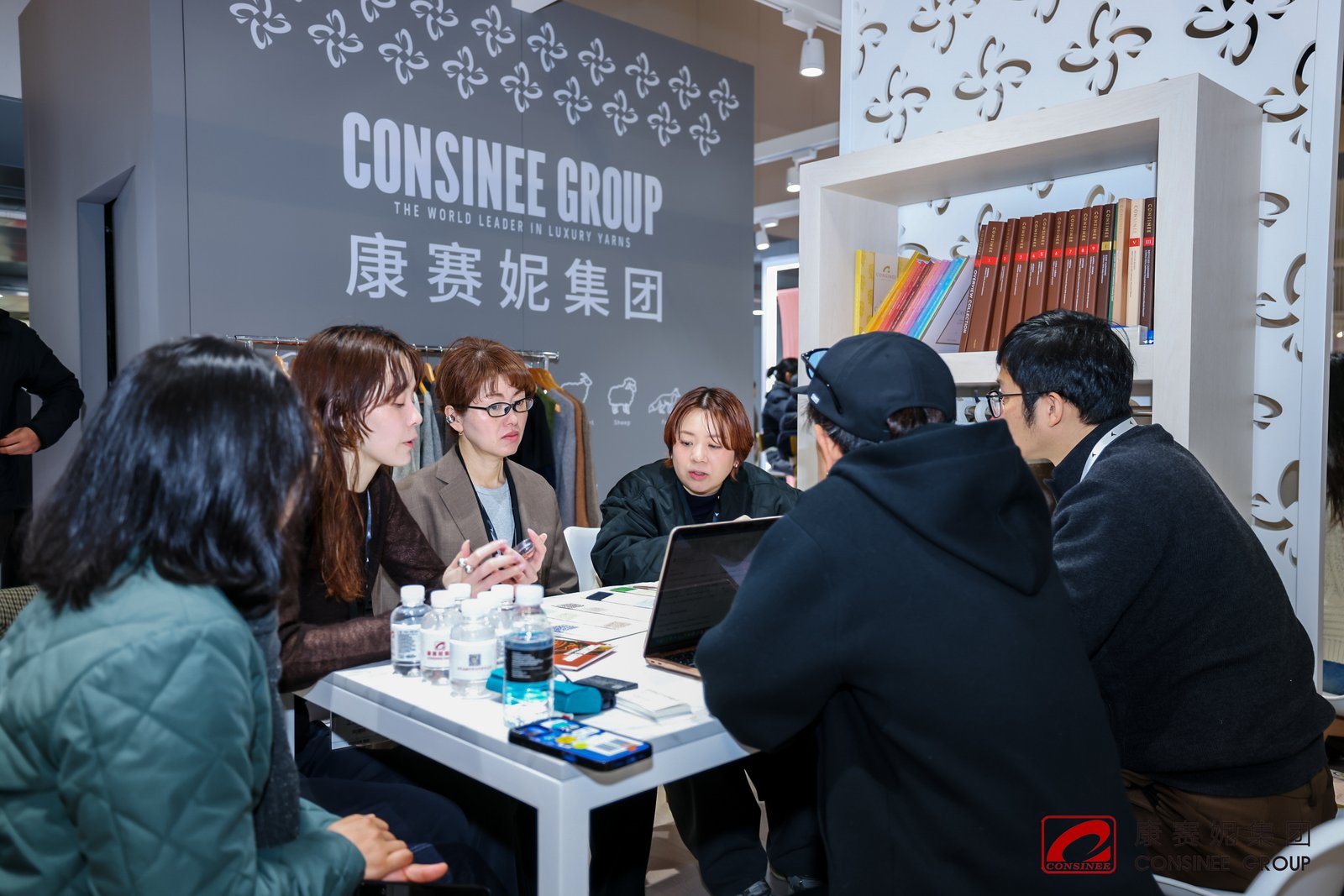 重点推介产品CS5280-73(70%羊绒、30%丝)、W3470-100(100%Wool)、WK5400-100(100%牦牛绒)、WN8460-90(90%羊毛、10%尼龙)、WBC3300-58(58%羊毛、30%酿造蛋白纤维、10%羊绒、2%氨纶)等成为全场焦点,充分展现了康赛妮在绿色制造与数字智造领域的领先实力,也契合本届展会“可持续创新”的核心趋势。